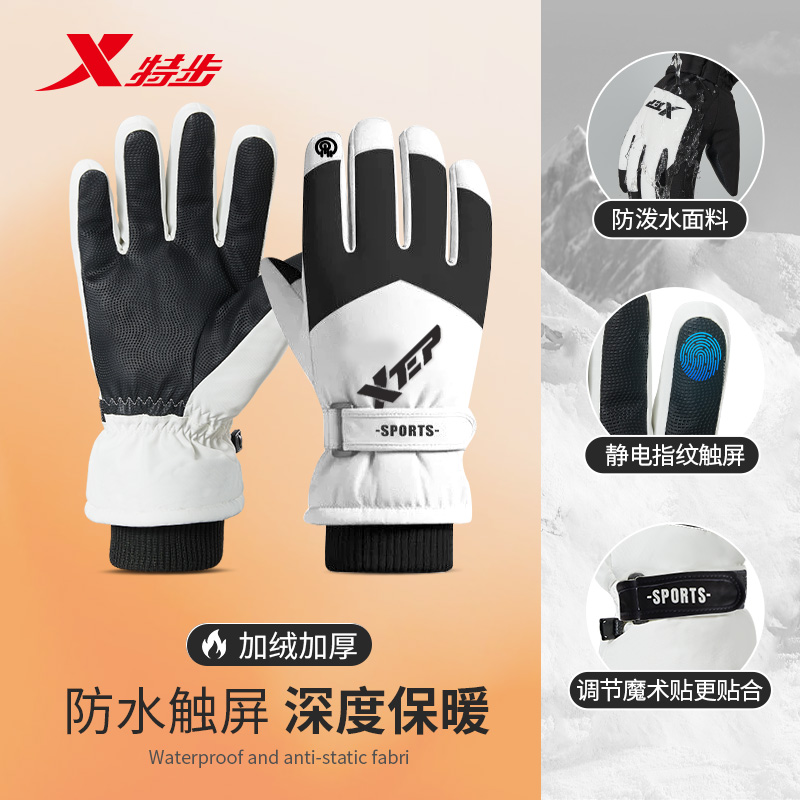 XTEP特步 保暖手套 男女运动手套 户外跑步摩托车全指套防寒加绒加厚滑雪防风手套 ABA305 白色