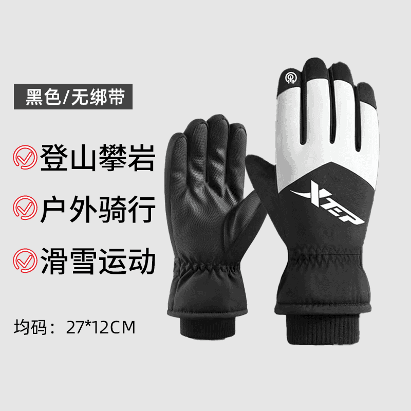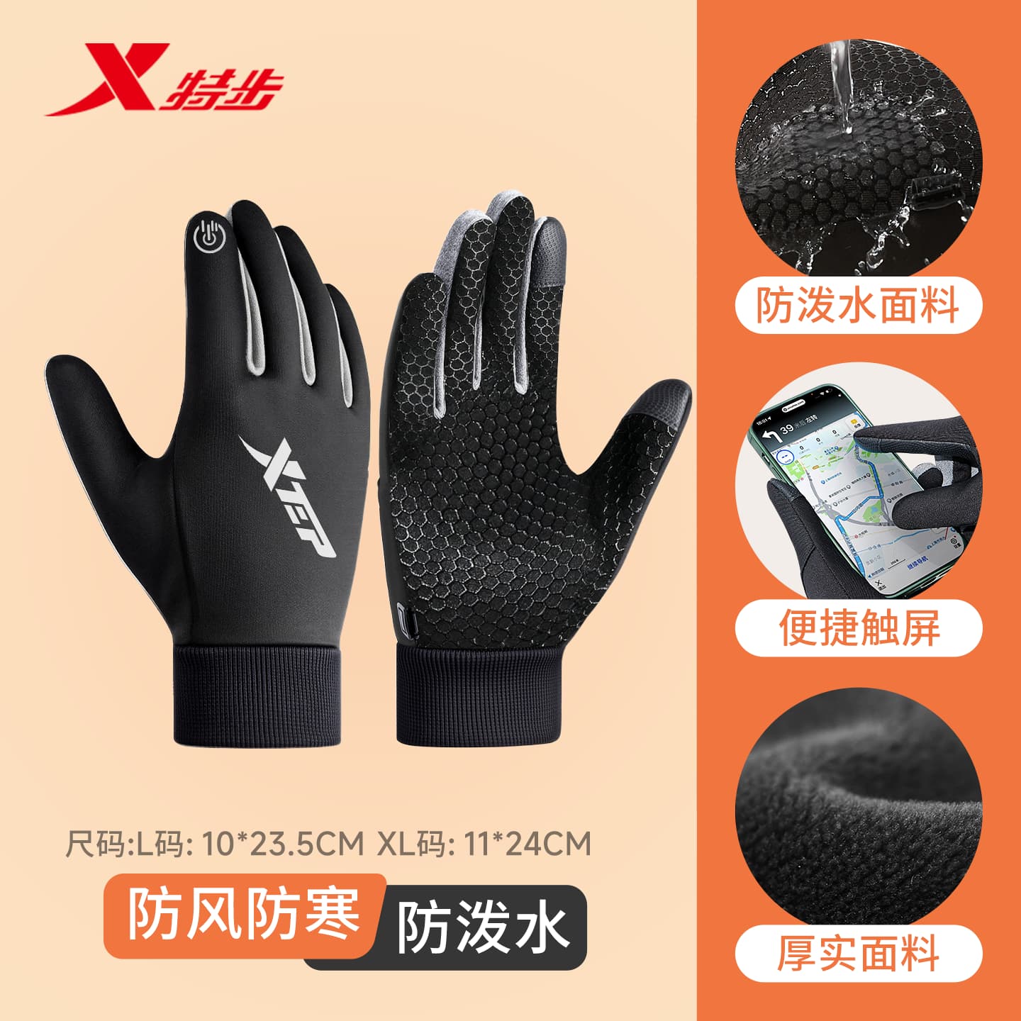 XTEP特步 保暖手套 男女运动手套 户外跑步摩托车全指套防寒加绒加厚滑雪防风手套 ABA305 黑色
