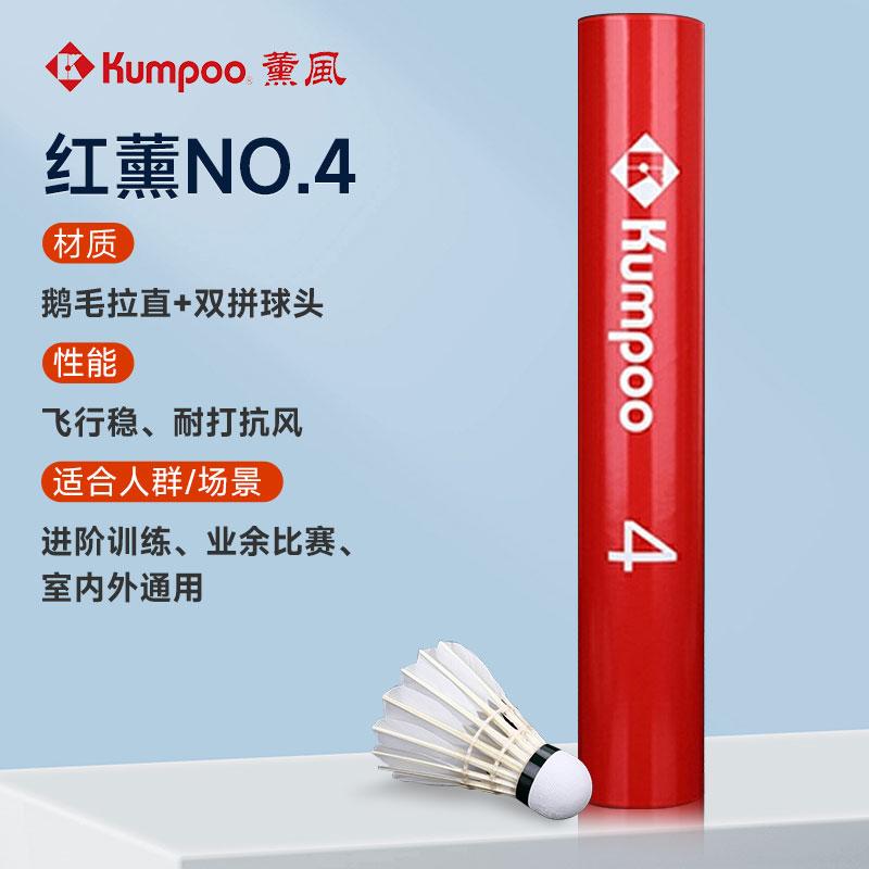 KUMPOO薰风羽毛球 KUMPOO NO.4 薰风4号专业比赛训练羽毛球 红薰风4号 红薰4号 12只装/筒精选优质拉直鹅毛 飞行稳定和耐打不易烂 落点精准 室内室外都能用