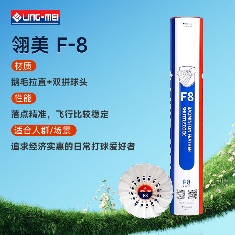 翎美LINGMEI羽毛球 F8鹅毛球(优质鹅拉直)厚实更耐打 专业训练比赛用球 12只/筒飞行稳定 落点精准 ,拉直鹅毛,性能相当李宁G200,红薰风4号