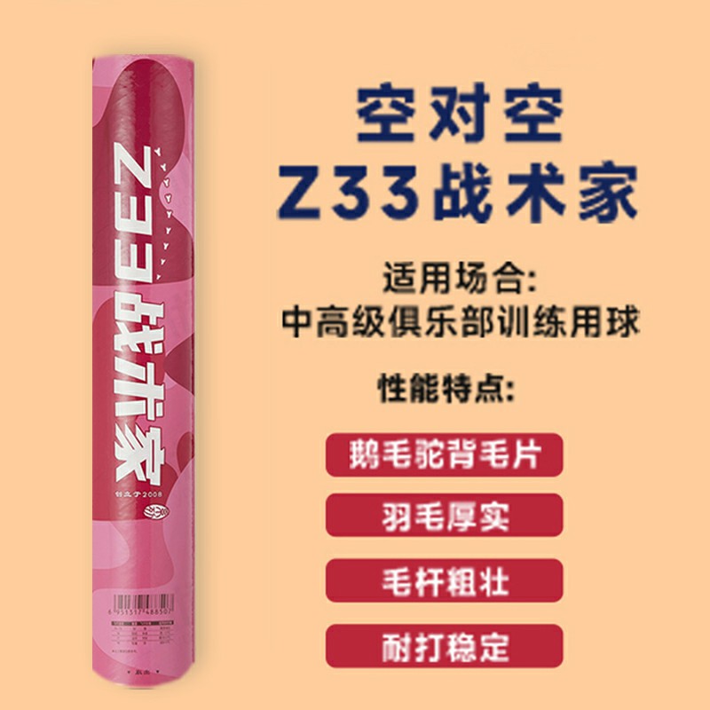 空对空 羽毛球 Z33战术家 俱乐部比赛训练用球 高性价比耐打稳定鹅毛球 12只/筒鹅毛驼背毛片,羽毛厚实,毛杆粗壮,耐打稳定