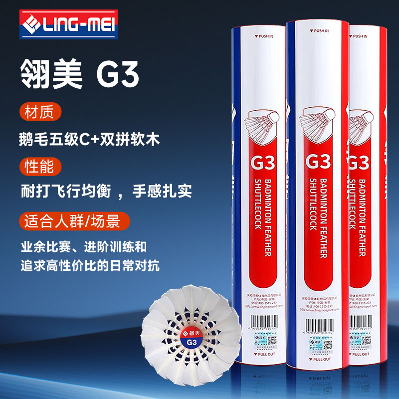 翎美LINGMEI羽毛球 G3 耐打鹅毛球(五级鹅毛) 俱乐部比赛训练用球 12只/筒 3筒装飞行稳定,经济实惠,落点精准。毛片为五级鹅毛,可能存在发黄情况,介意者慎拍!