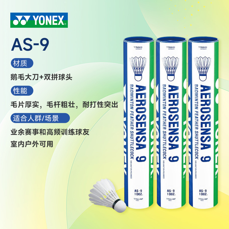 YONEX尤尼克斯 AS-9羽毛球 AS9特选鹅毛球AS09(羽球中的耐打王)AEROSENSA 9 12只/筒 3筒装飞行转速良好, 球的落点精准,羽毛球中的耐打王!