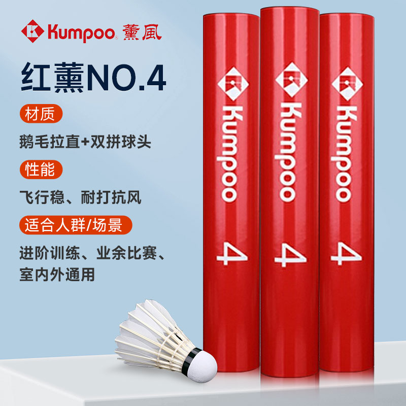 KUMPOO薰风羽毛球 KUMPOO NO.4 薰风4号专业比赛训练羽毛球 红薰风4号 红薰4号 12只装/筒 3筒装精选优质拉直鹅毛 飞行稳定和耐打不易烂 落点精准 室内室外都能用