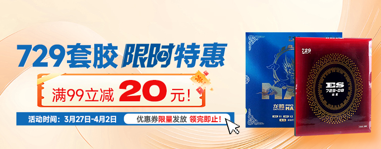 活动说明:春尚新|套胶焕新,立减开抢!729等品牌指定款套胶满99立减20,限量优惠券仅100张,领完即止。使用时间:3.27–4.2!春日换新胶,上场更给力!