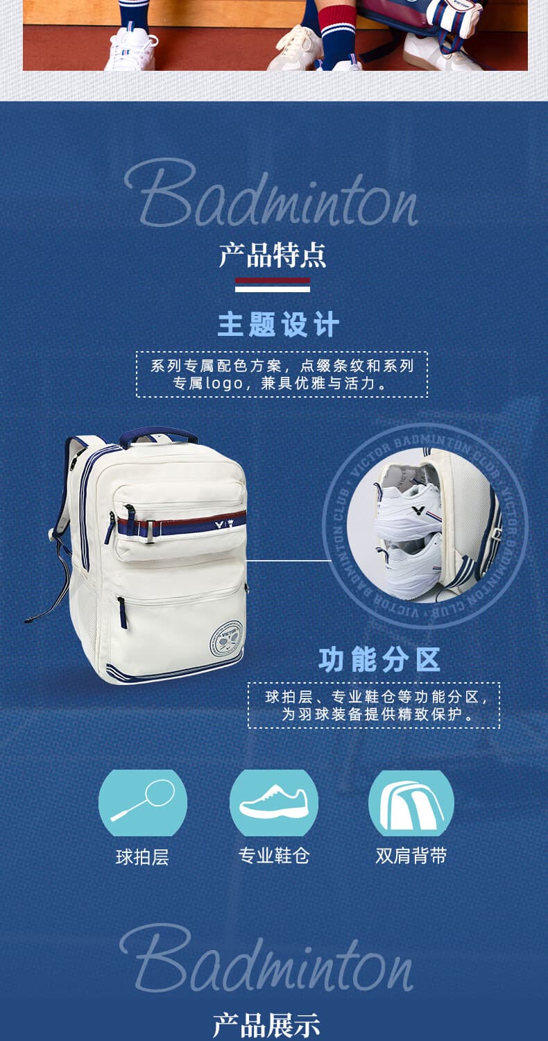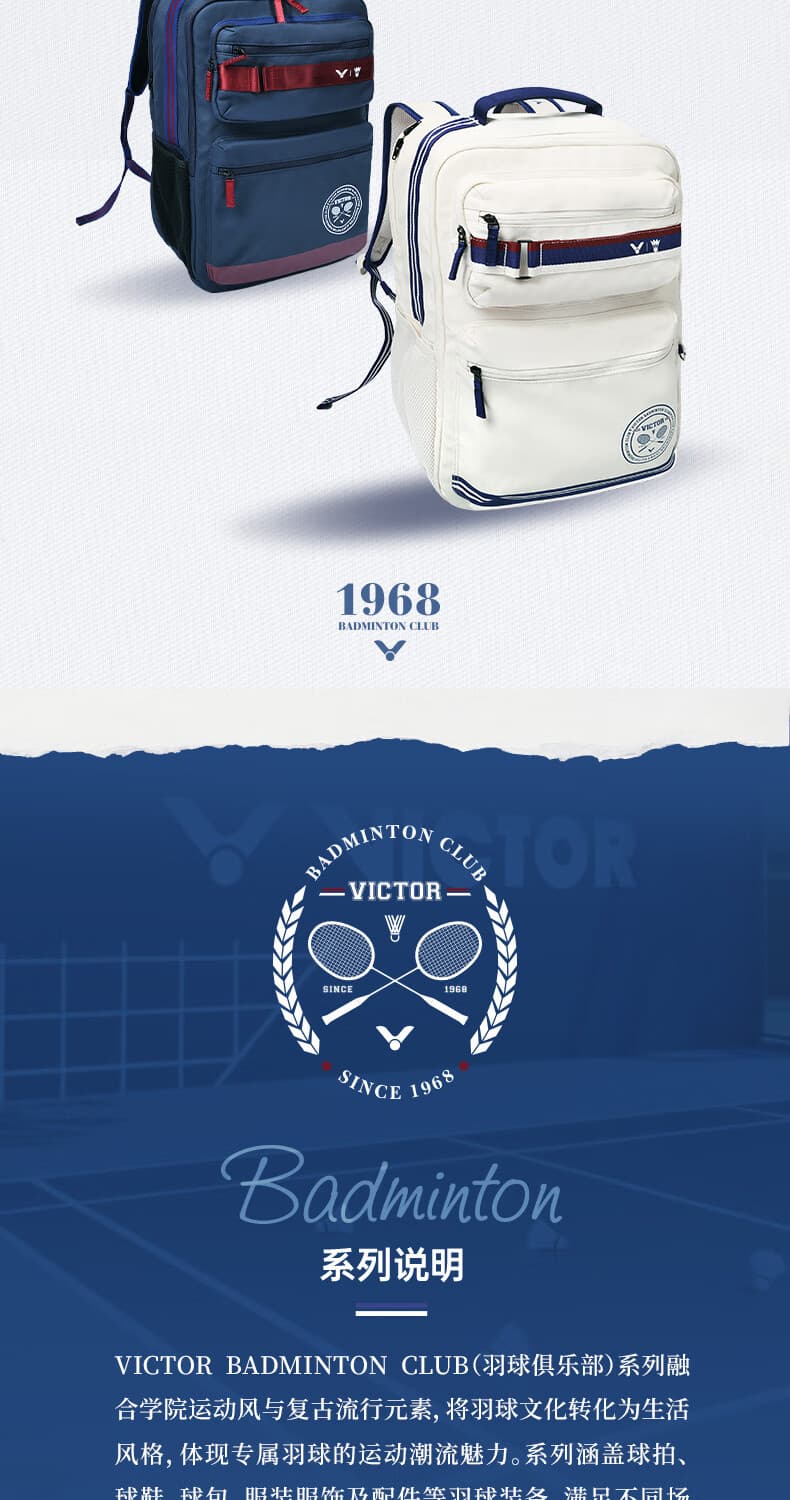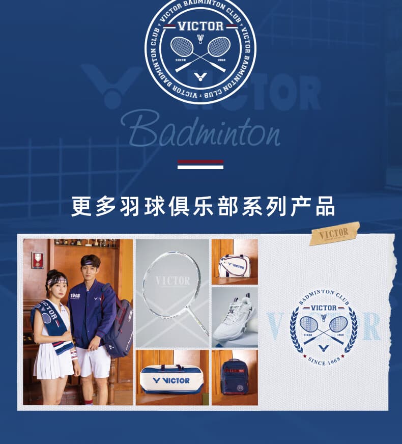 VICTOR BADMINTON CLUB系列巧妙融合学院风与复古元素,把球场上的热血激情延伸到生活每一刻。专属配色如“亮白/青石英”清新亮眼,“信标蓝/樱桃红”活力四射,搭配经典条纹与品牌LOGO,轻松打造高辨识度运动造型。