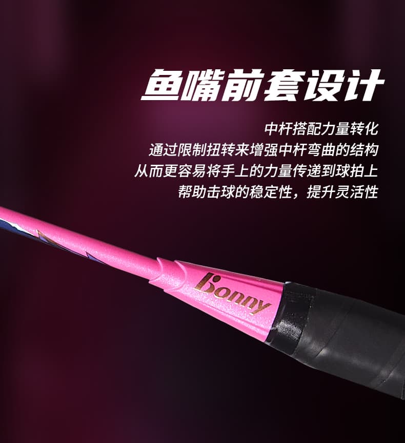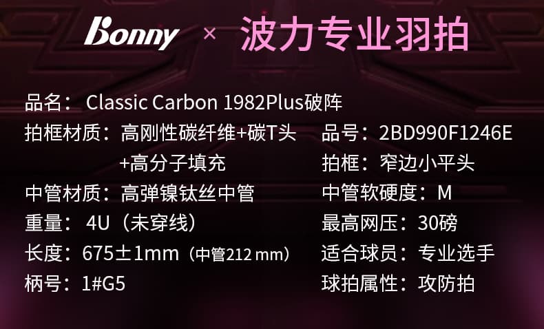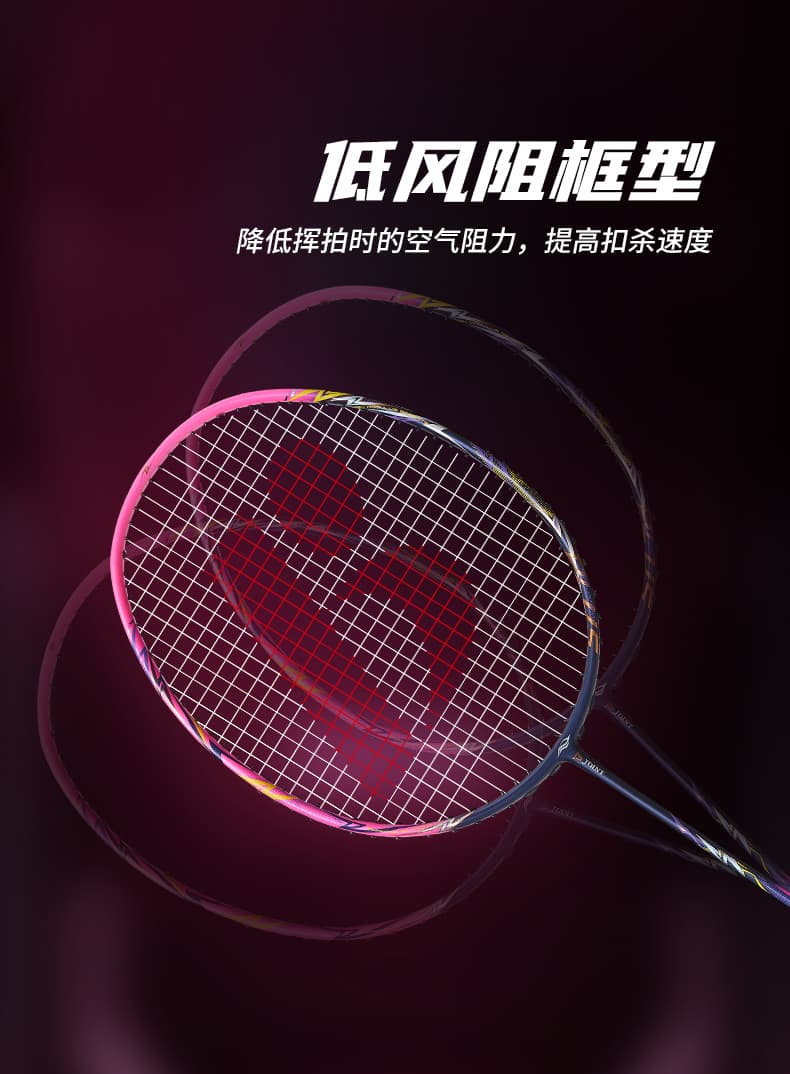 此款波力破阵羽拍是原先1982P的升级版,拍框依然延续了经典的椭圆形框型的设计,攻防兼备。超细拍框的设计,使得整体的挥拍很流畅。76孔的线孔,半凹槽的设计。碳纤维采用的是高端的材质。