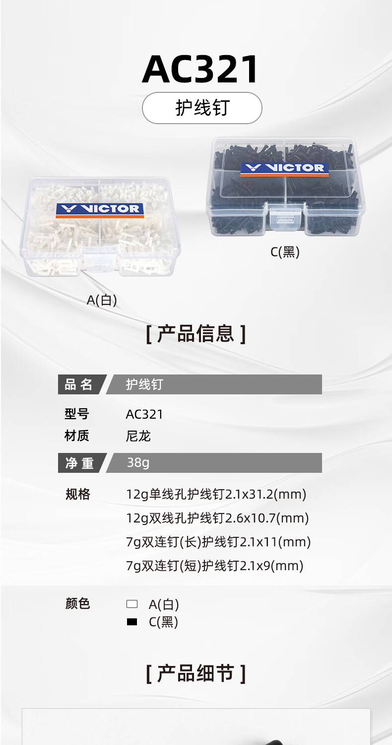 威克多VICTOR胜利羽毛球拍护线钉 AC321C 单线孔双线孔双连钉拍框护线管全套盒装 【小盒装】护线钉 黑色/白色 替换型护线钉,简单方便实用