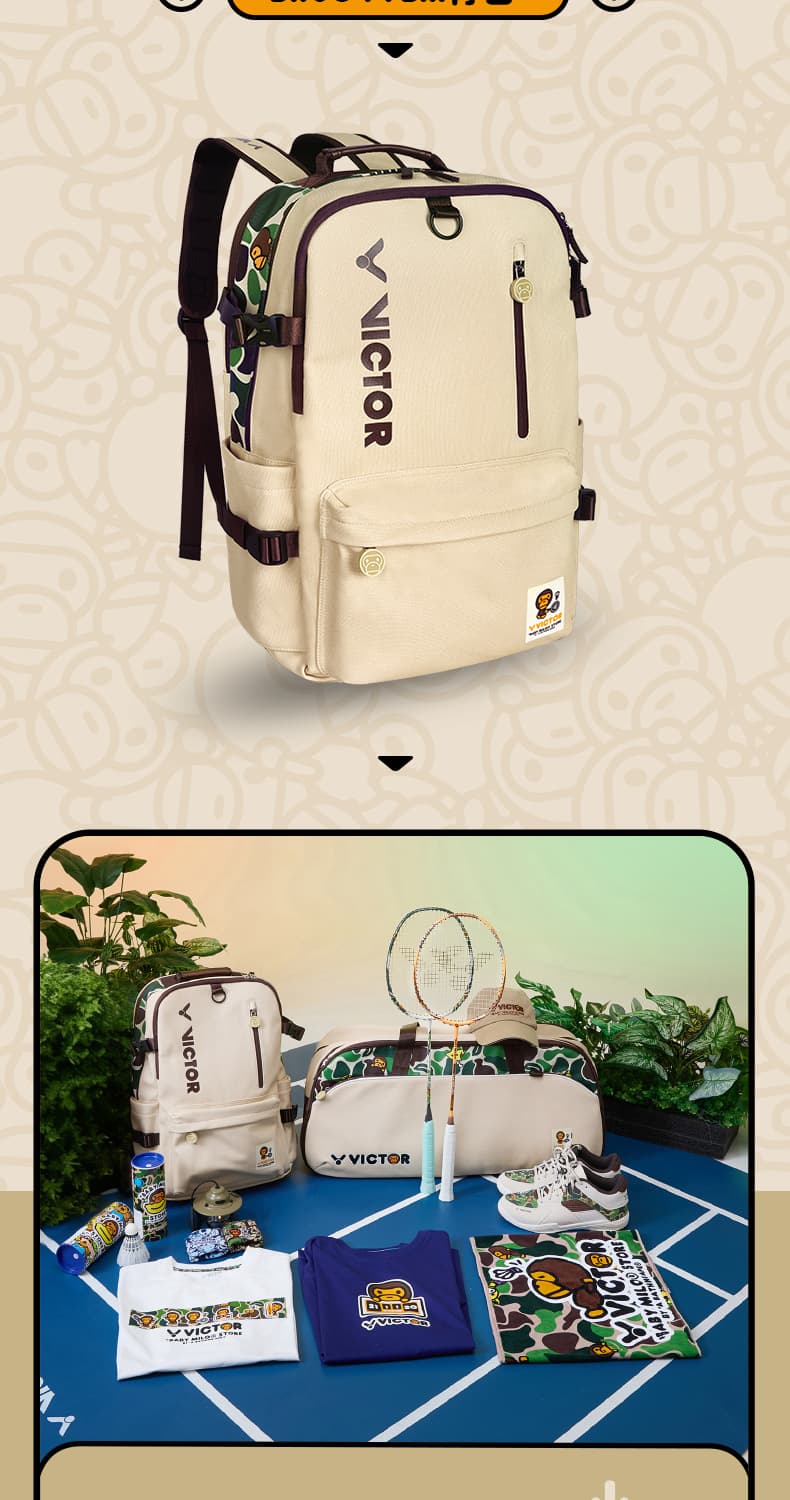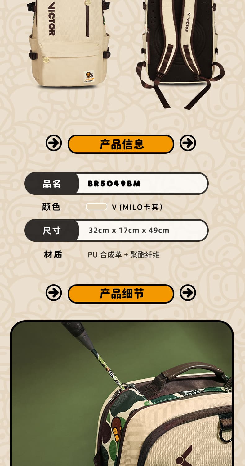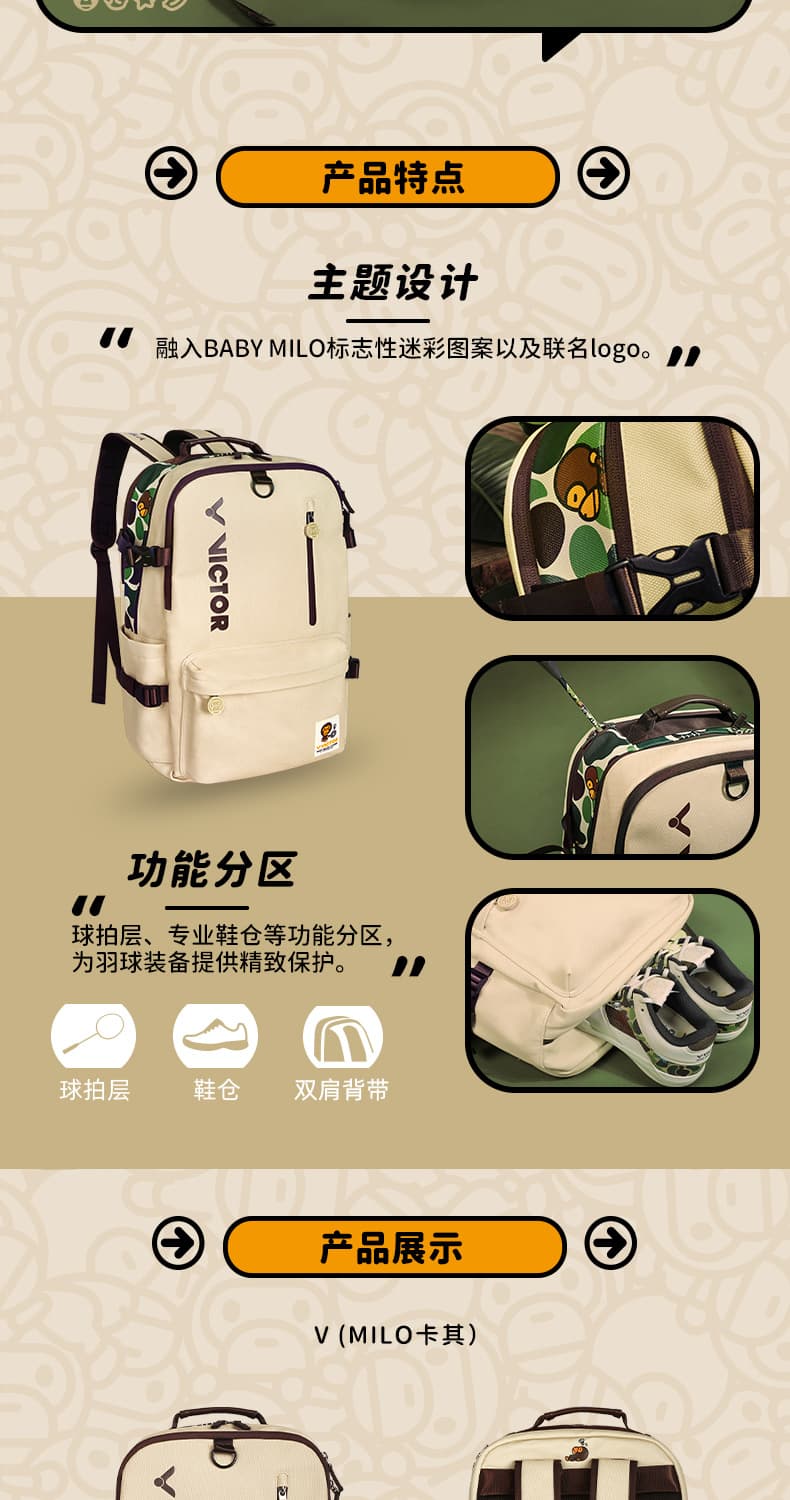 VICTOR 威克多 BABY MILO联名系列 运动双肩背包 大容量独立鞋仓拍仓运动背包 BR5049BM 卡其 本品参加超级宠粉日满129减20 299减50 499减80 999减120元大促!