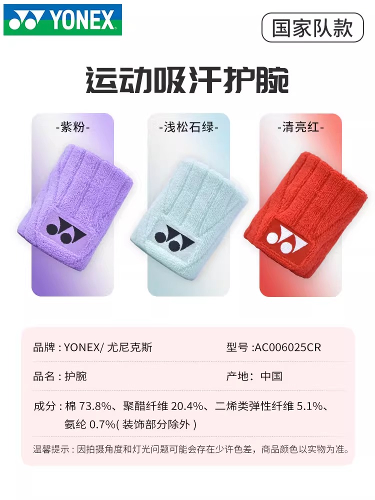 YONEX 尤尼克斯 羽毛球运动护腕 yy吸汗护具 AC006025 国羽同款 多色可选 单只装 舒适吸汗 高弹透气 保护手腕