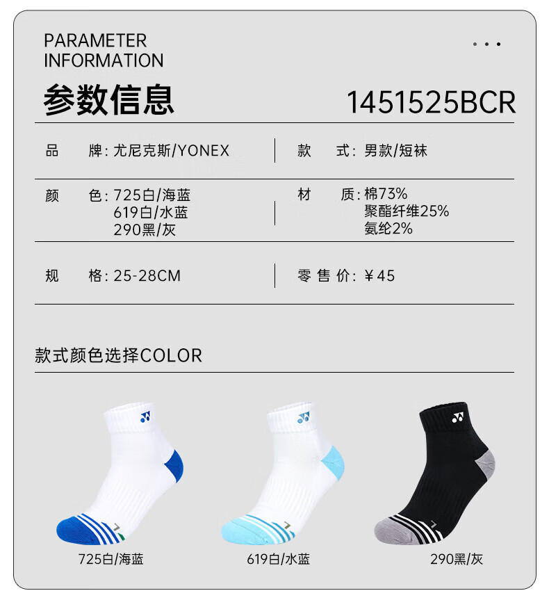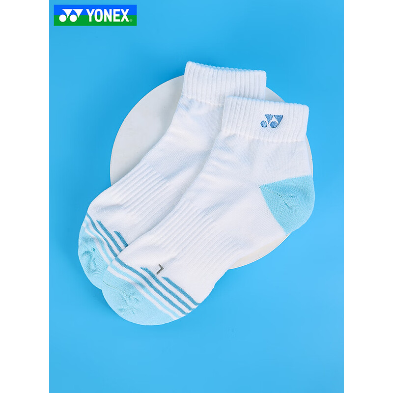 YONEX尤尼克斯 yy新款羽毛球袜 男加厚毛巾底运动袜子 透气吸汗短筒袜1451525BCR_619 白/水蓝色 防滑耐磨 舒适包裹