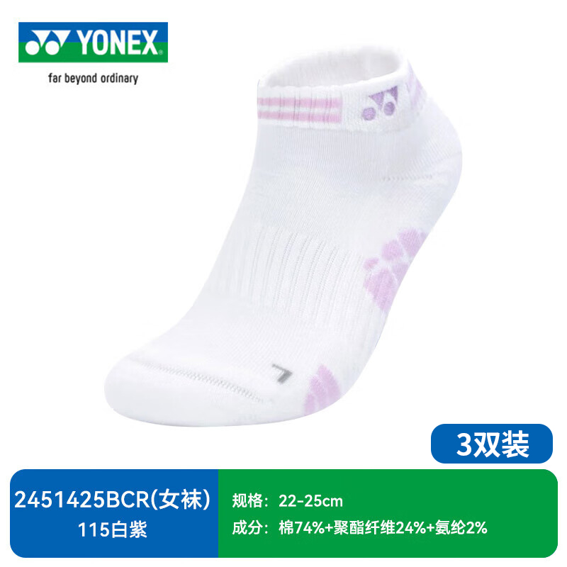 尤尼克斯YONEX羽毛球袜 女款运动袜 低帮健身袜 yy吸汗透气短筒袜2451425BCR_115 白/紫 本品参加运动年货节满129减20 299减50 499减80 999减120元大促!