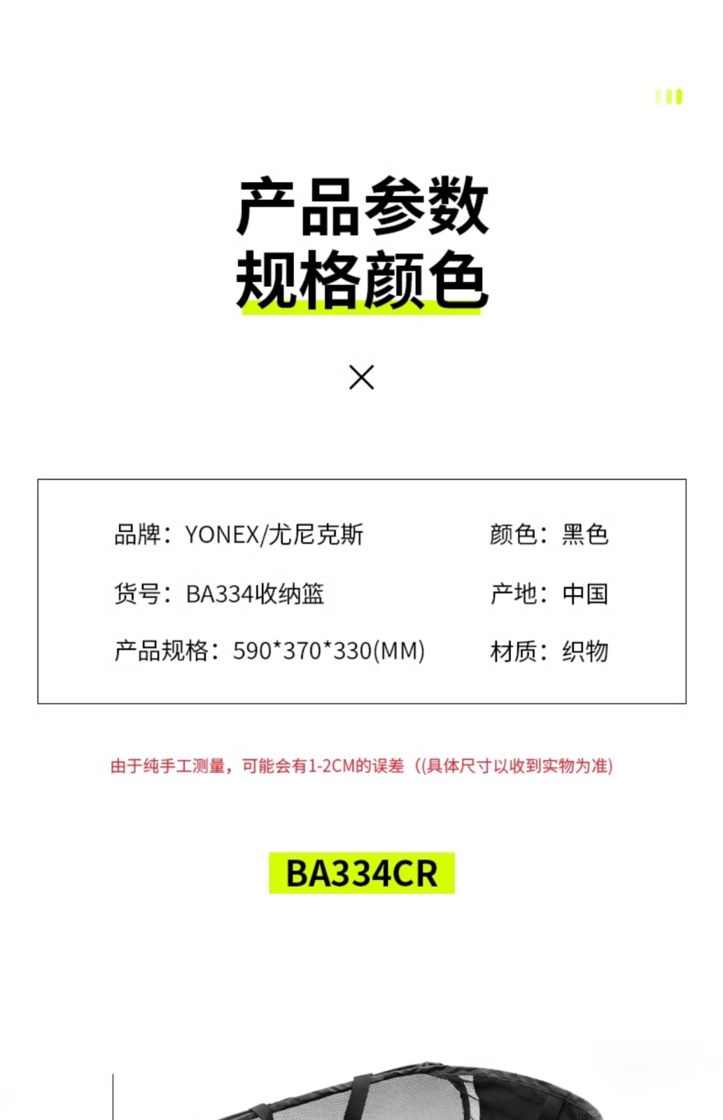 YONEX 尤尼克斯 羽毛球拍收纳筐 便携式大容量 手提折叠收纳篮 BA334CR 黑色 本品参加11.11狂欢购满129减20 299减50 499减80 699减100 999减150 1299减200元大促!
