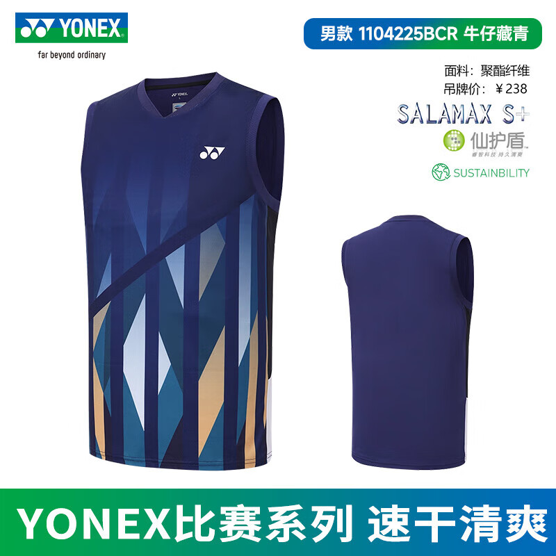 YONEX 尤尼克斯 羽毛球服 男款 无袖T恤 马甲背心 速干透气运动比赛服 1104225BCR 牛仔藏青 本品参加12.12运动狂欢购满129减20 299减50 499减70 699减100 999减150元 1299减200元大促!