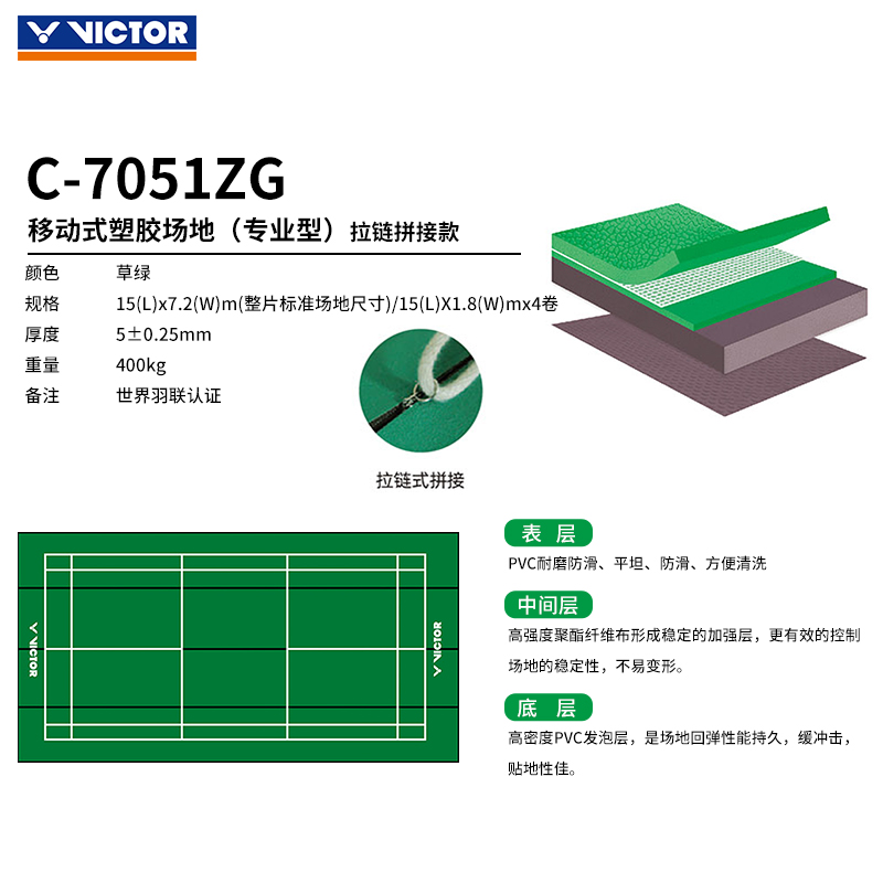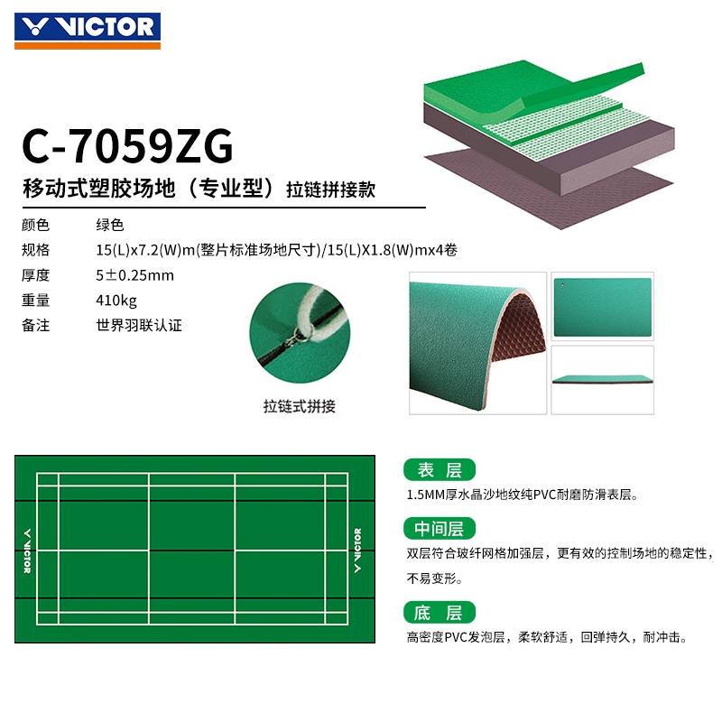 威克多VICTOR 胜利羽毛球塑胶场地胶 C-7059Z/G 拉链式专业型 运动地胶 一片1500×720×0.5cm BWF世界羽联认证