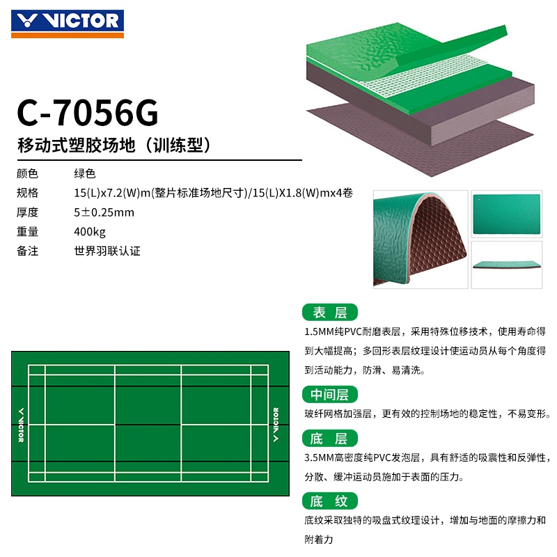 威克多VICTOR 胜利羽毛球塑胶场地胶 C-7056/G/F 训练型 运动地胶 一片1500×720×0.5cm BWF世界羽联认证