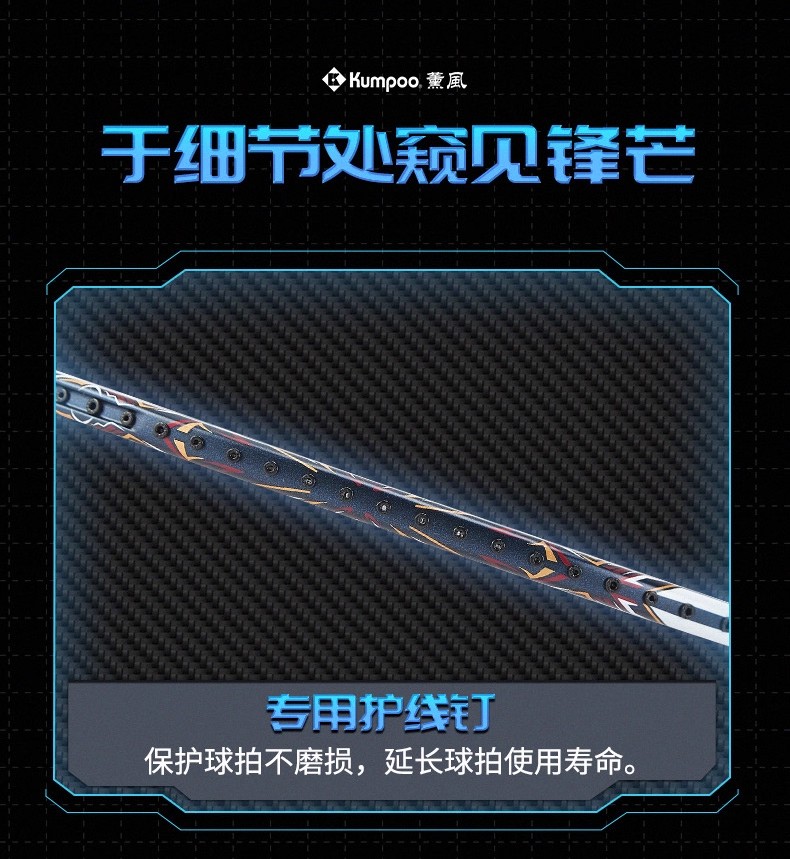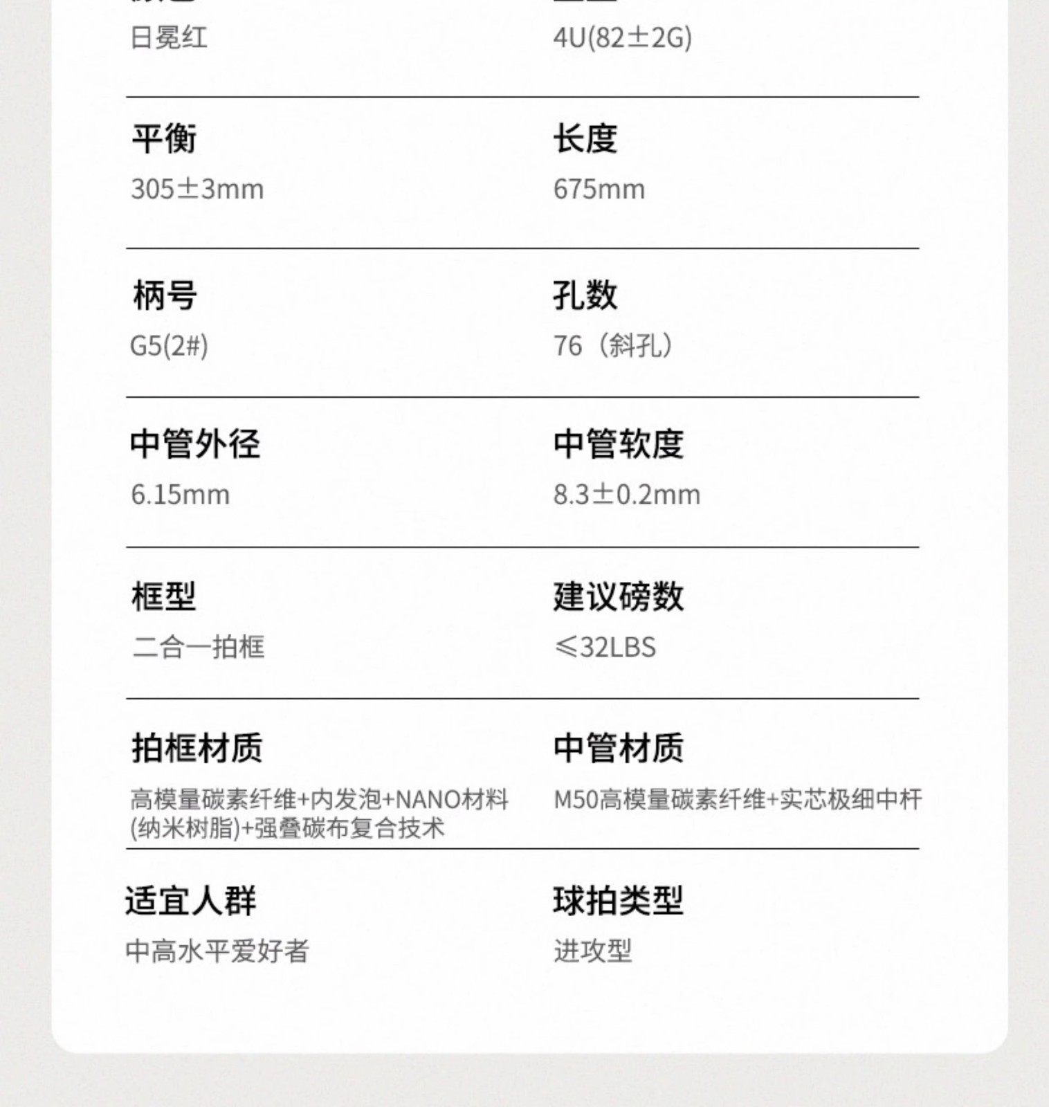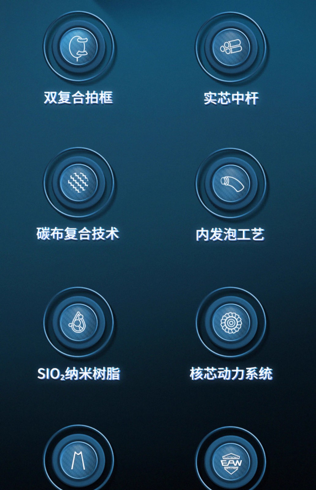 拍框材质:高模量碳素纤维+内发泡+NANO材料(纳米树脂)+强叠碳布复合技术