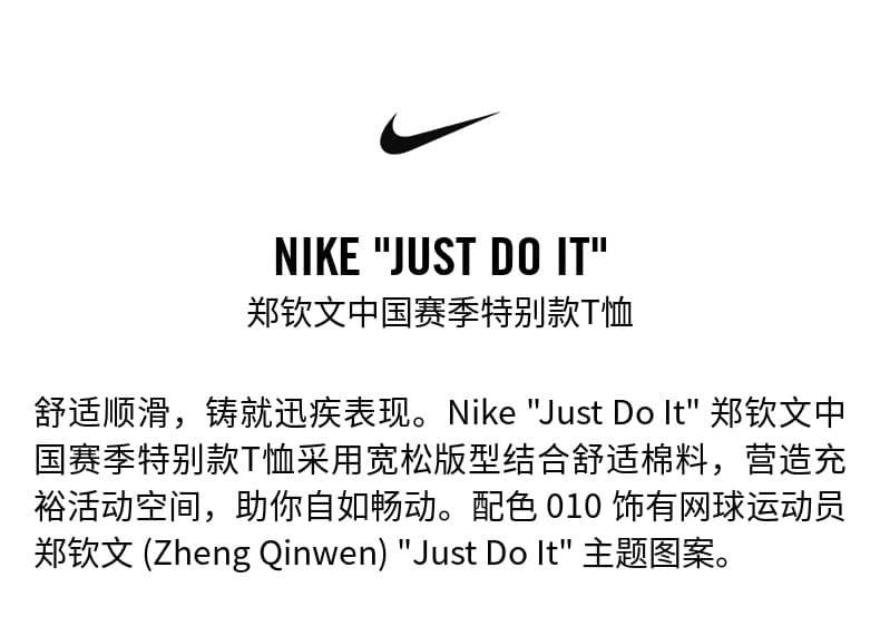 NIKE耐克网球服 JUST DO IT郑钦文中国赛季特别款网球T恤纯棉宽松舒适短袖 IV6815-010 黑色 郑钦文中国赛季特别款,宽松版型结合舒适棉料,助你运动自如!