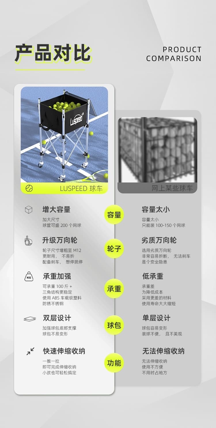 Luspeed乐思拼 网球收纳车便携式推车万向轮不锈钢大容量网球车【高度可调】 黑色