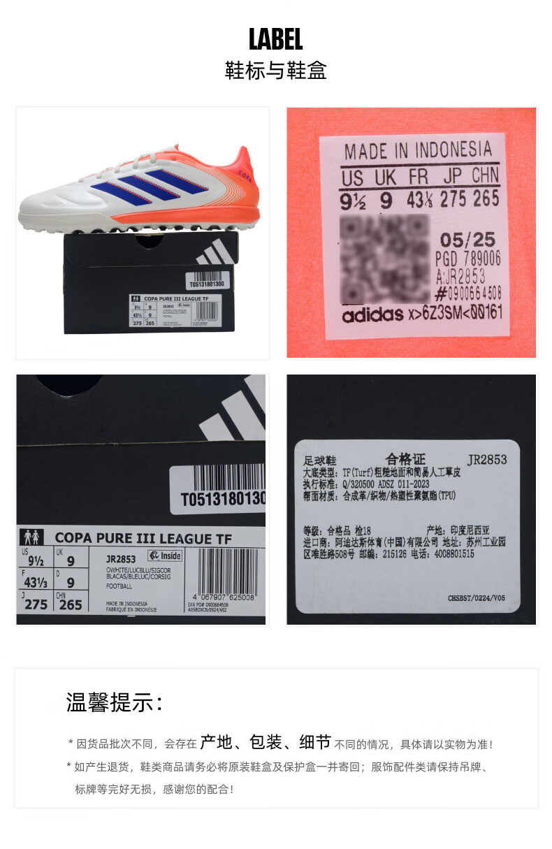 ADIDAS阿迪达斯 男女COPA PURE III LEAGUE TF碎钉足球鞋 JR2853 白/蓝/粉 防滑耐磨 包裹性强