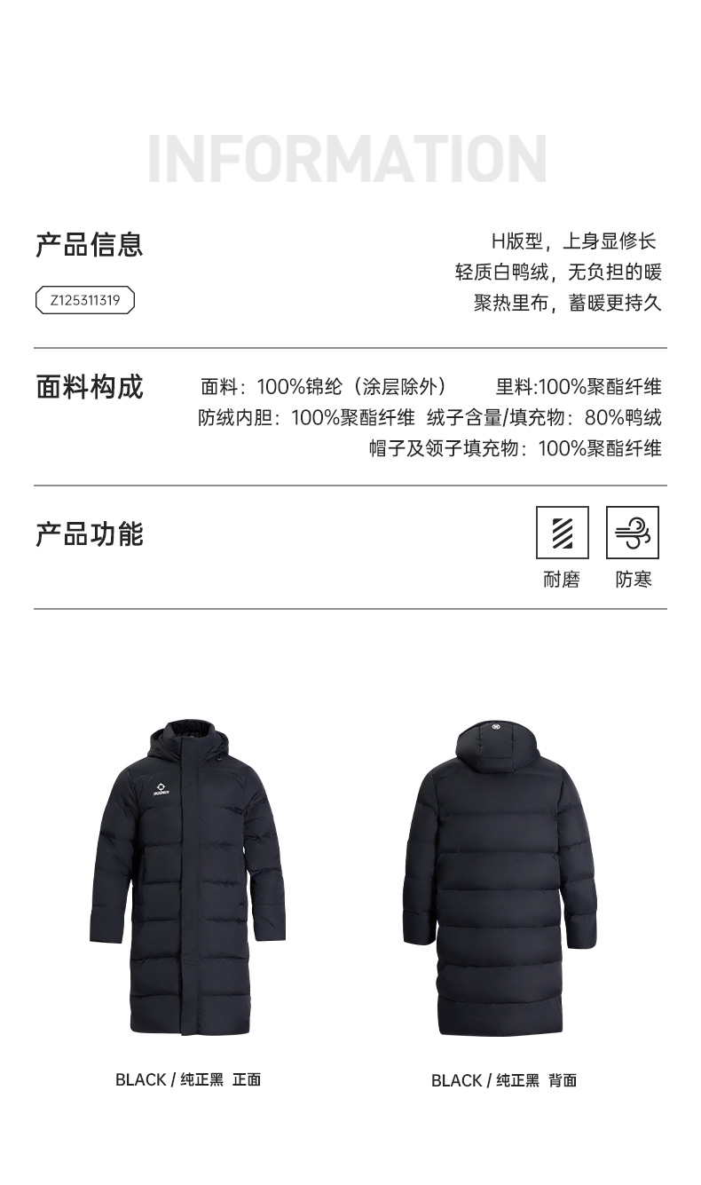 准者羽绒服 长款连帽过膝防风鸭绒保暖外套运动训练大衣 Z125311319纯正黑 时尚版型 多重防风