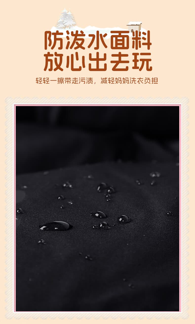 防风防泼水实用设计:外层高密度梭织面料,有效阻隔寒风。