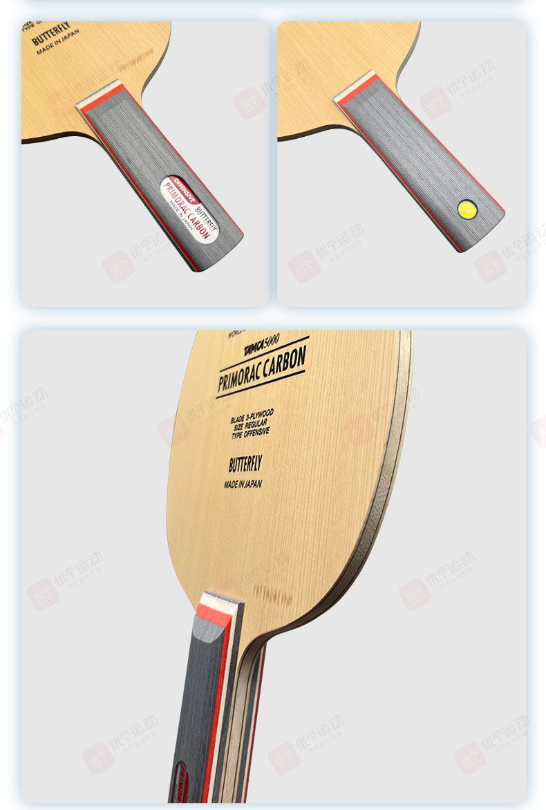 蝴蝶普里莫拉茨碳板特点:双碳板,较硬。横板为世界名将普里莫拉茨使用。速度极快,弹性好,易发力,不失柔和的控球感,脱板速度快。近台宜打,极暴,中远台拉球相持好,前冲强弧线低,底劲足。进攻威力巨大,防守可衰减前冲力,十分稳健,攻守转换,随心所欲。经典攻击型底板。