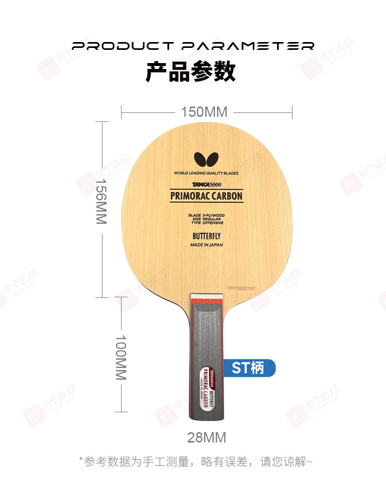 蝴蝶普碳乒乓底板横拍30101(普里莫拉茨碳Butterfly PRIMORAC CARBON-FL) 包装: