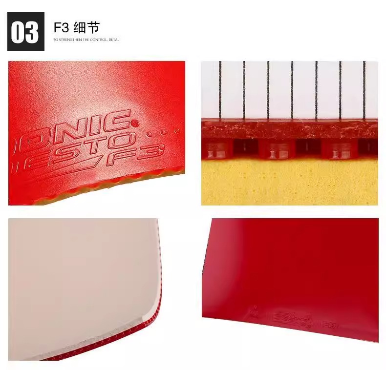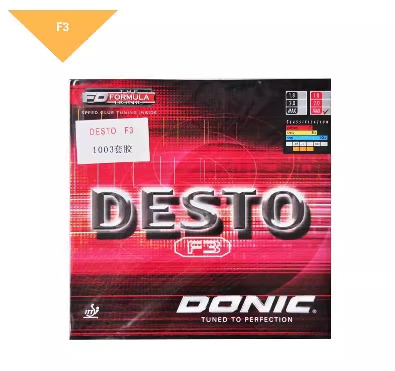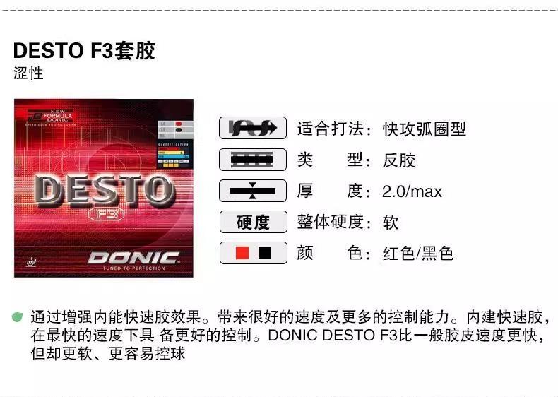 带来同样的球速及更多的控制能力,内建快速胶,在最快的速度下具备更好的控制。DONIC DESTO F3比一般胶皮速度更快,但却更软、更容易控球。适合不想要再使用快速胶,或是从未使用快速胶而想尝试的球员使用,这些使用者可以从1.8mm厚度开始用。