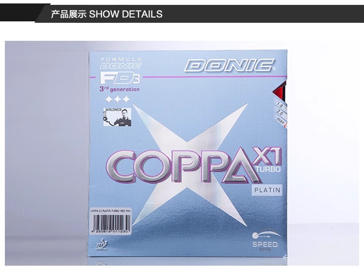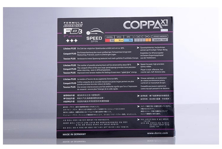 速度及旋转的极限。比起之前的Coppa系列,最新的Coppa系列套胶在极速下,能制造更多的旋转及更好的弧线。铂金Coppa X1 Turbo 特别适合离台上旋。具有减少出错,更准确的特性。速度的极限,准确性高,旋转极强烈的套胶。适合进攻,快速旋转回球,中台。