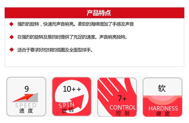 ◆非常柔软的海绵增加了手感及声音,在强烈的旋转及推挡时提供了充足的速度。声音 响亮独特。