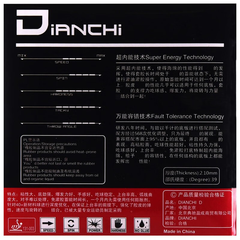 典驰乒乓套胶 超内能典驰D版反胶套胶(已打底) 蓄能充沛,粘性十足 产品信息:
