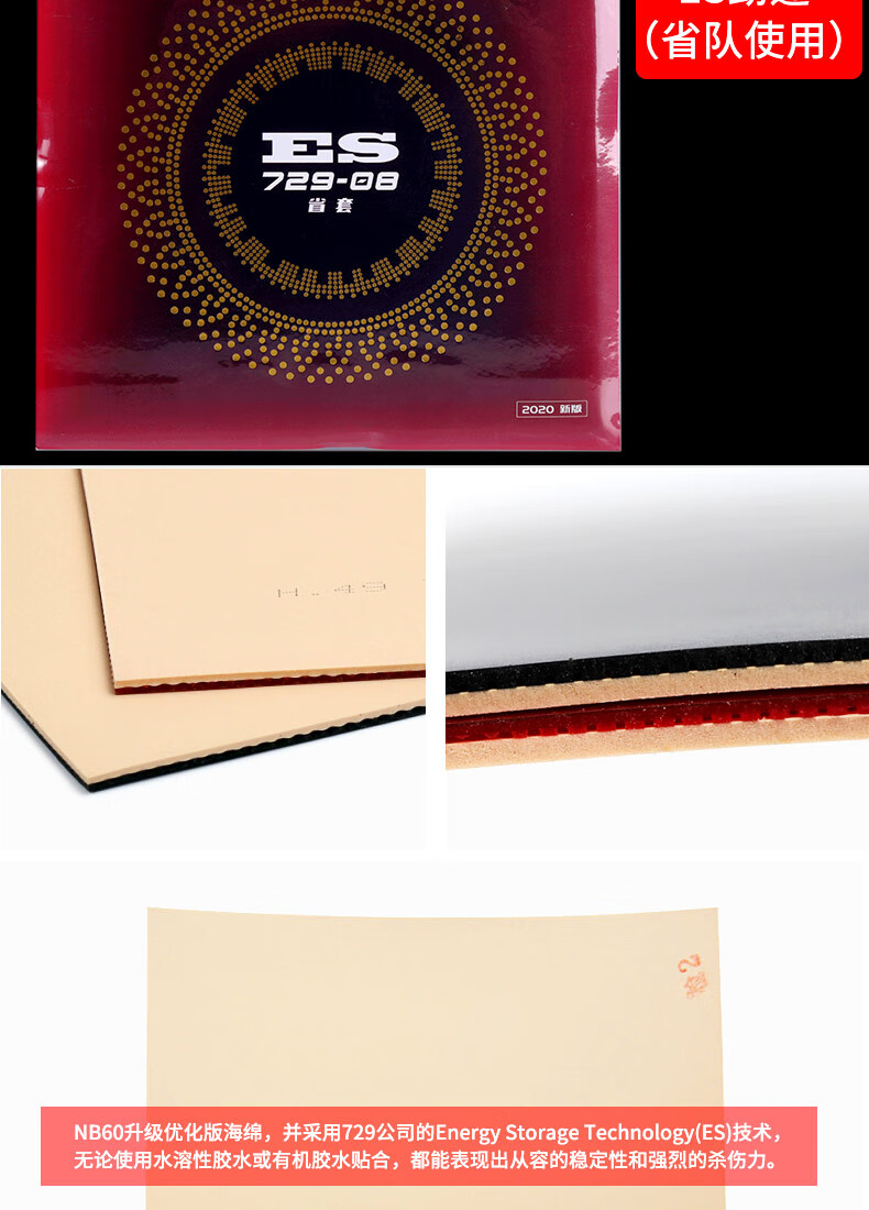 729-08劲?貳S套胶省队特供版,采??预张力储能技术,此项技术可确保该套胶在凃刷专业水溶性胶水后,性能等同于传统灌胶的贴合方式, 并可确保VOC<2,完全符合国际乒联规定.