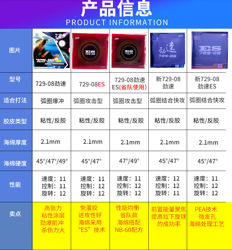 友谊729省队特供729-08 劲速ES 无机内能反胶套胶 产品信息: