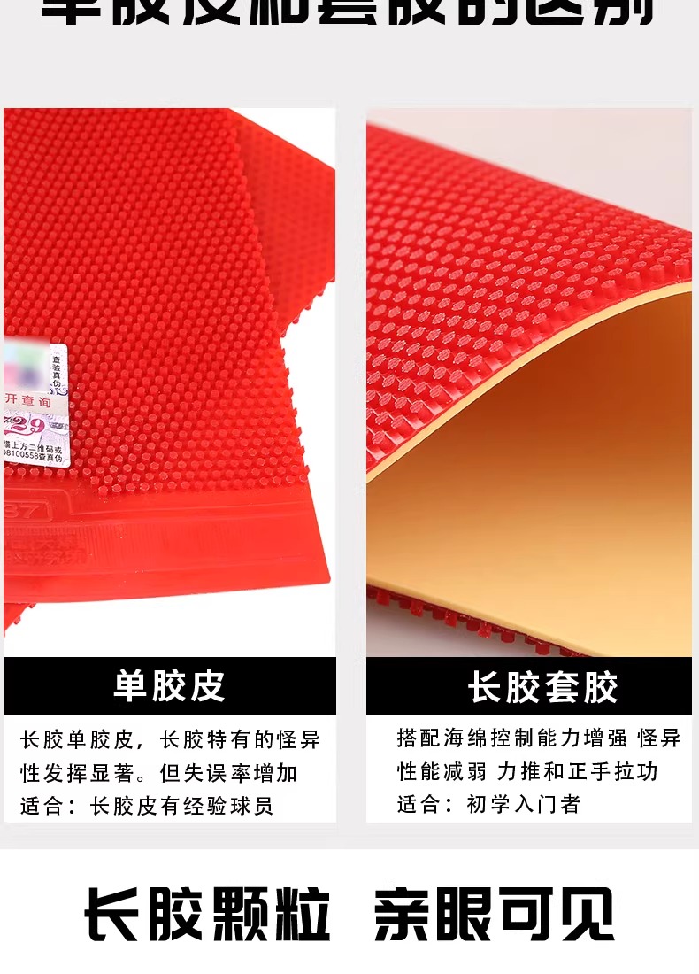 755长胶是天津橡胶工业研究所积多年经验研究和生产的一种长胶。具有反旋转特性,攻球下沉,韧性强,回球路线飘忽不定,对弧圈球有防御作用。将它与729配合使用,会产生强大威力,使对手迷糊,长期以来被称为魔术胶粒,世界冠军邓亚萍等使用该产品。