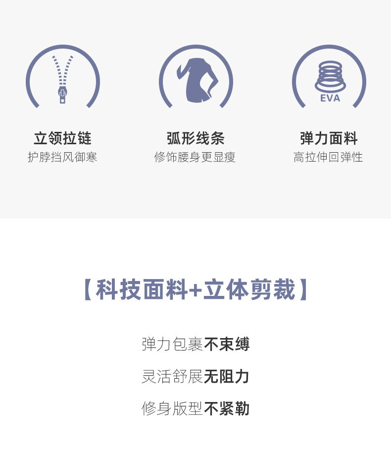 修身版型不紧勒立领拉链 护脖防风御寒,方便穿脱不压迫;