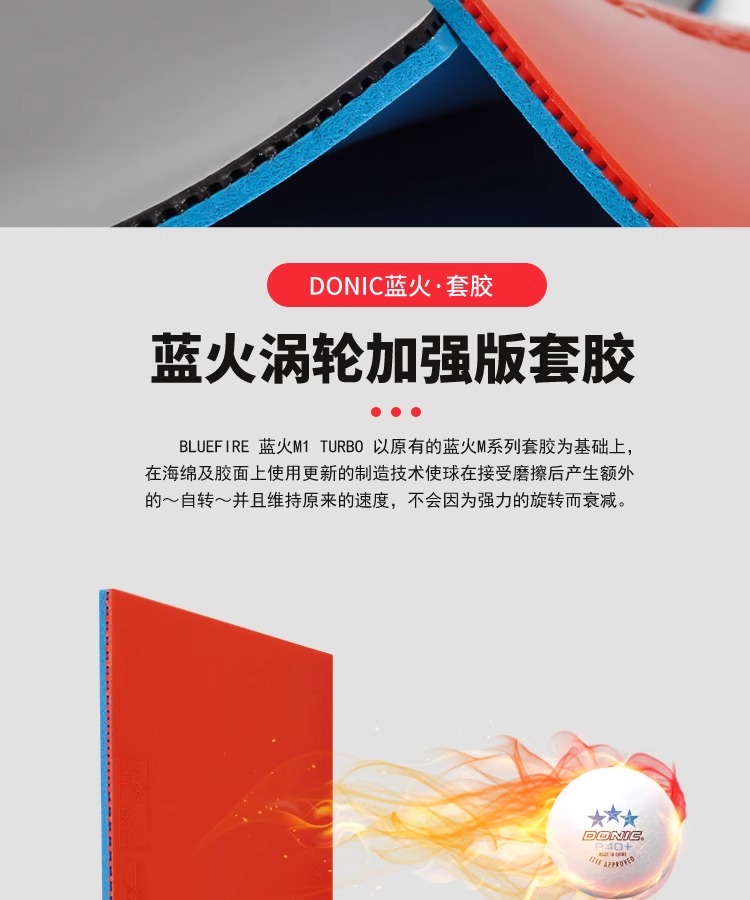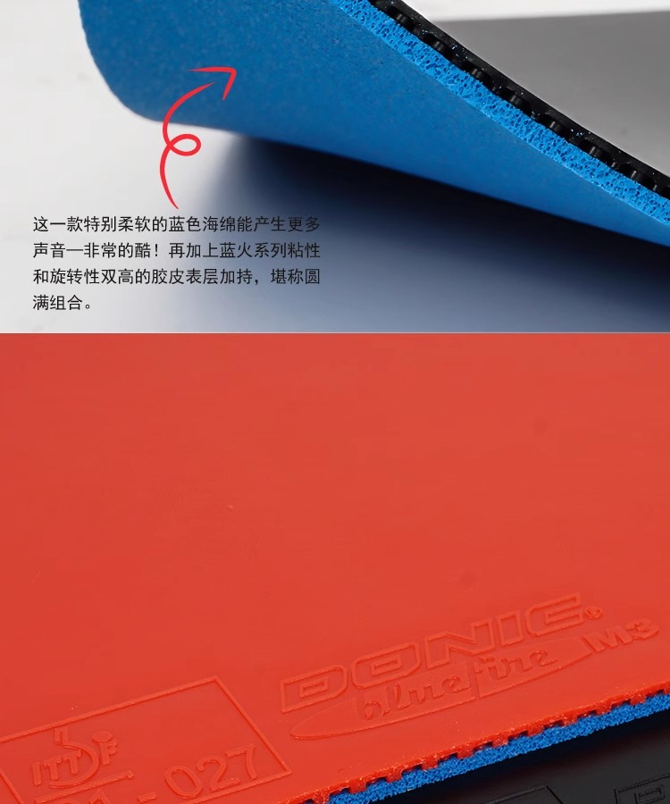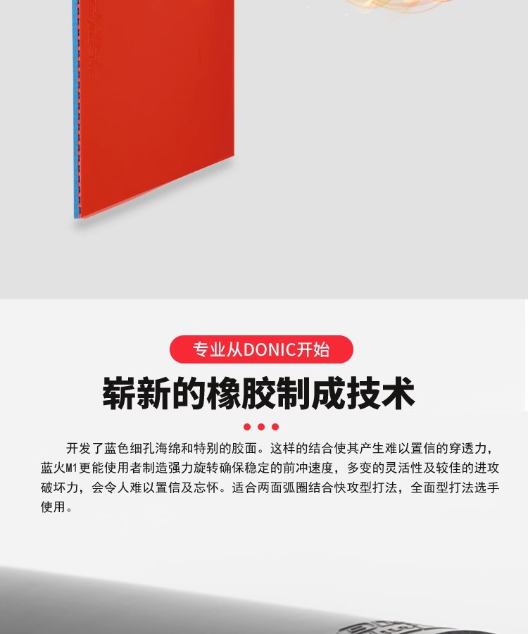 蓝色奇迹: 蓝火系列是由多尼克研发,能为球手提供极高击球速度的一种全新套胶。新一代高端技术的套胶,融入了经验证的FD3技术配方,该研发结果完美结合了大气孔蓝色海绵和极度旋转的套胶表面。套胶的胶表面结构,是由细长的胶粒组成,有助于发挥套胶最大的灵活性,并拥有绝佳的击球感。 除此之外,蓝火的特殊地方在于,当以不可置信的速度击打出高速旋转的高弧线球的时候,能使之产生最大限度的旋转并提高球的速度。