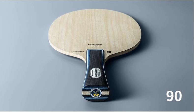 产品特点:Carbonado 90是由90度角的碳纤维构入涂层;90度角实现了底板卓越的弹性性能,并在硬手感上兼具稳定性和速度;低平延展的出球轨迹让其成为了以高速抽击来掌控比赛的球员首选底板;高长的个性化甜区;Textreme碳素淡化创造更好的持球感及更接近纯木的击球感。