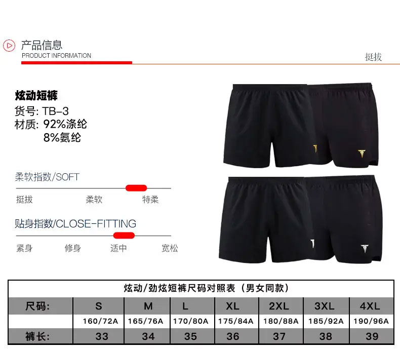 挺拔TIBHAR TB3 黑金色乒乓球运动短裤