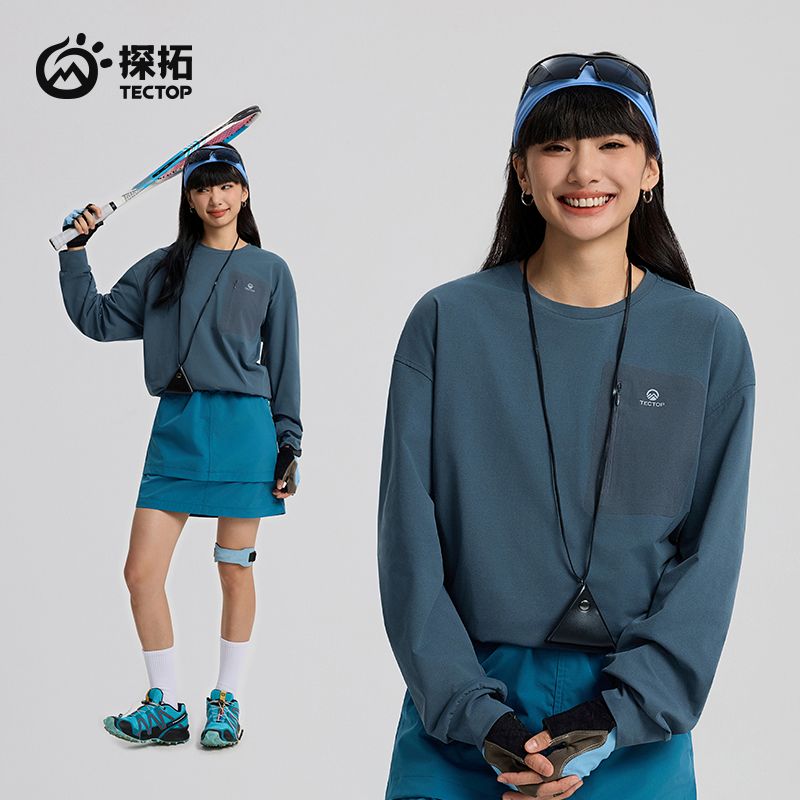 TECTOP探拓 户外速干长袖 男女款春夏防晒透气运动宽松训练服 深蓝灰/长石灰-女款 2512410TX