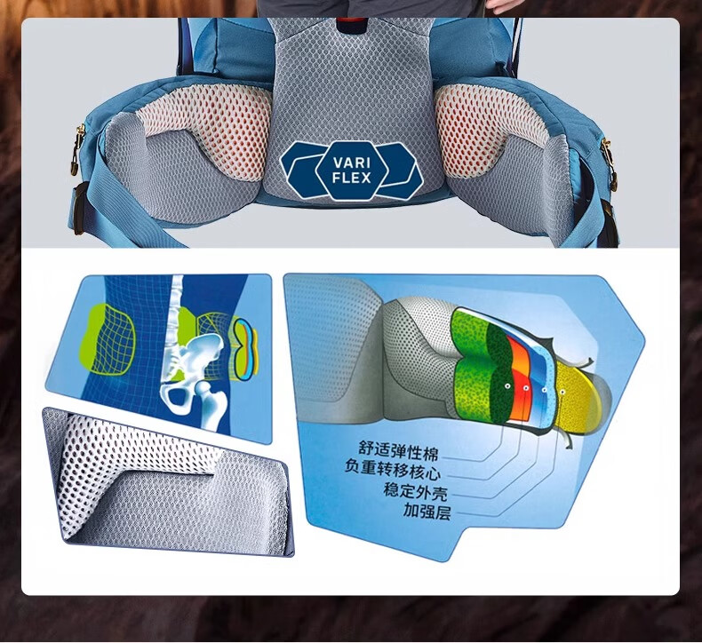 AIRCONTACT CORE 满足背包旅行/徒步露营/乡舍远足出行需求,带有Air Spacer Mesh 和大型通风通道的 Aircontact 空塔背负系统、符合人体工程学的 ActiveFit 肩带和可调节胸带确保了背负舒适性。Y形框架、可移动的腰翼和符合人体工程学的腰垫确保了良好的负载分布。