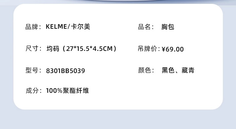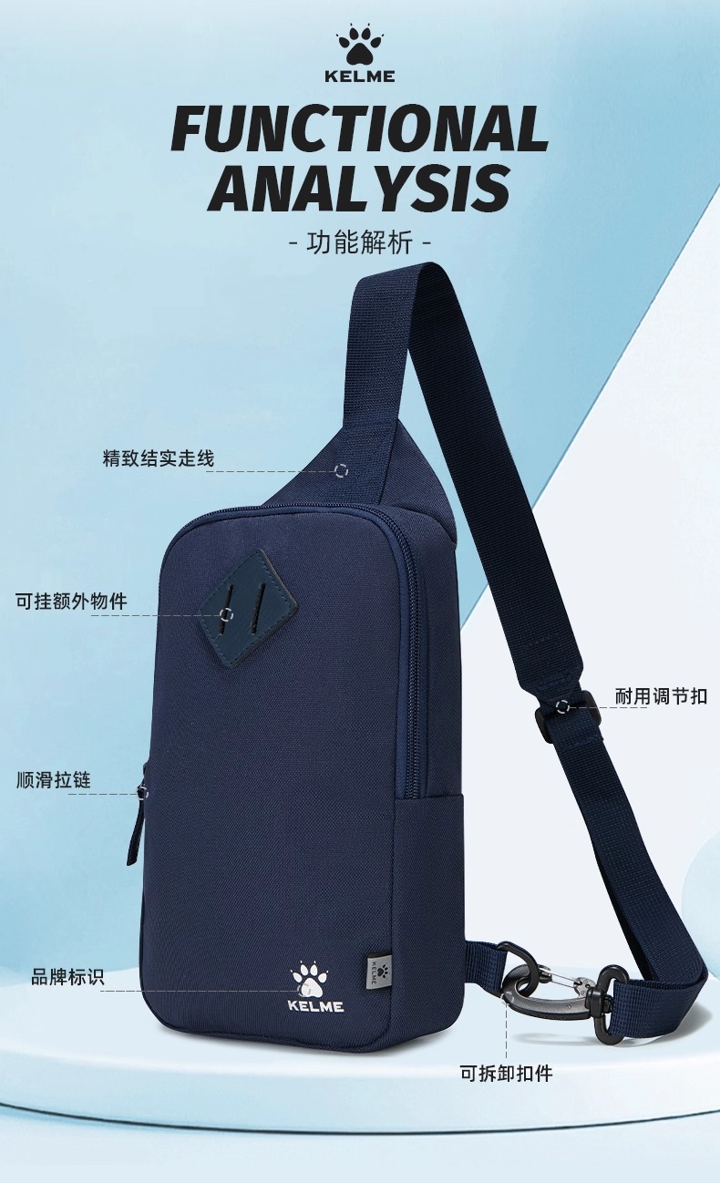 KELME卡尔美 新款运动胸包 男女同款健身旅行单肩包时尚潮流斜挎包 8301BB5039均码 防水耐磨 便捷收纳