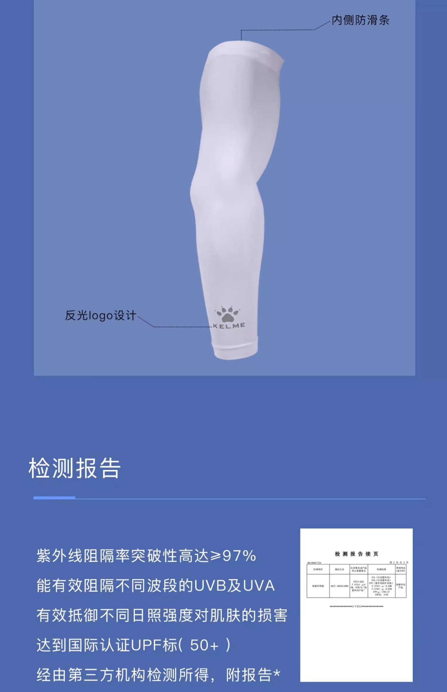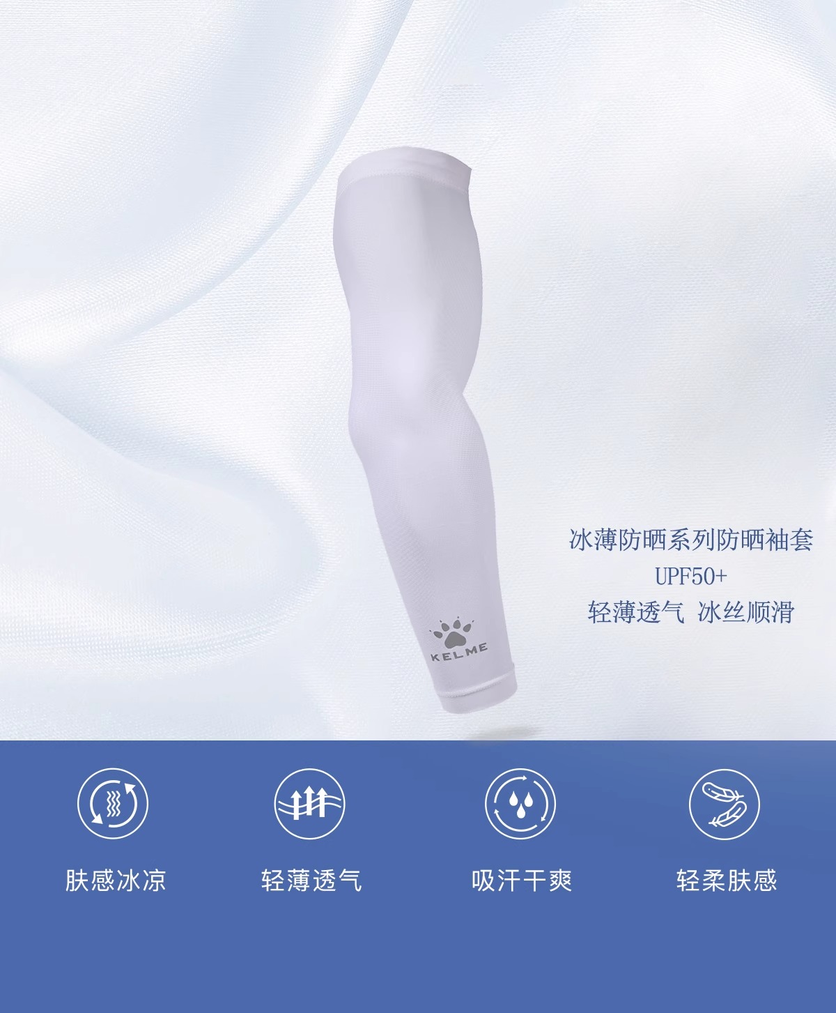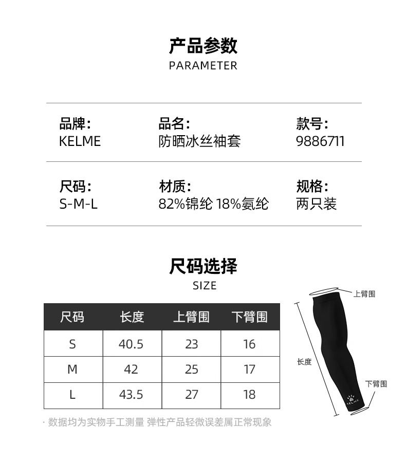 KELME卡尔美 防晒袖套男女冰丝手臂袖子 夏季薄款防滑透气护臂套袖 9886711白色 UPF 50+ 清凉防晒 防滑透气