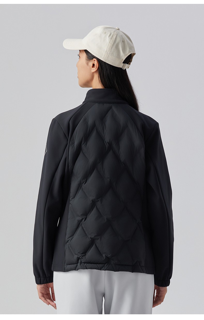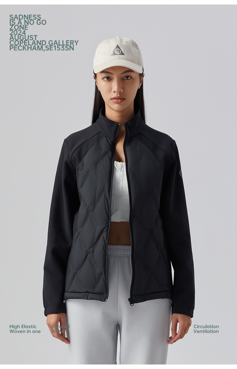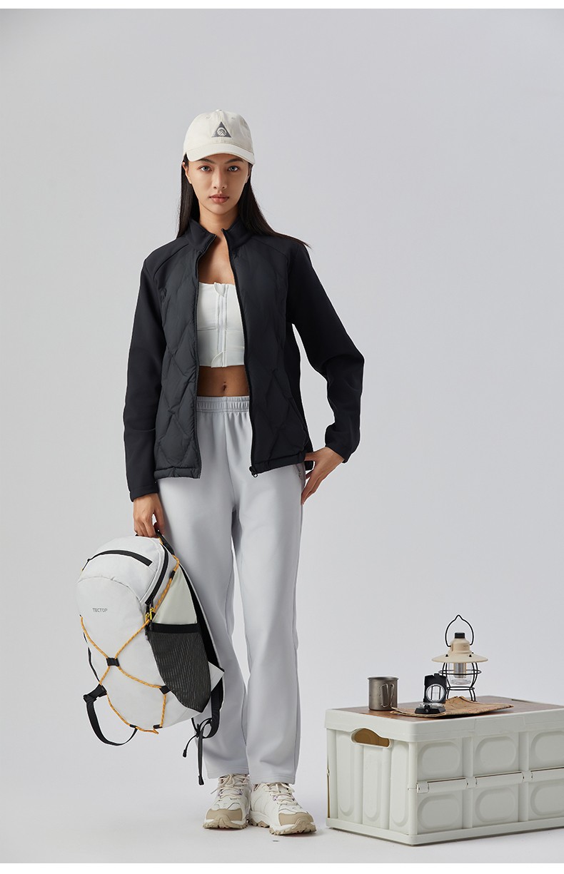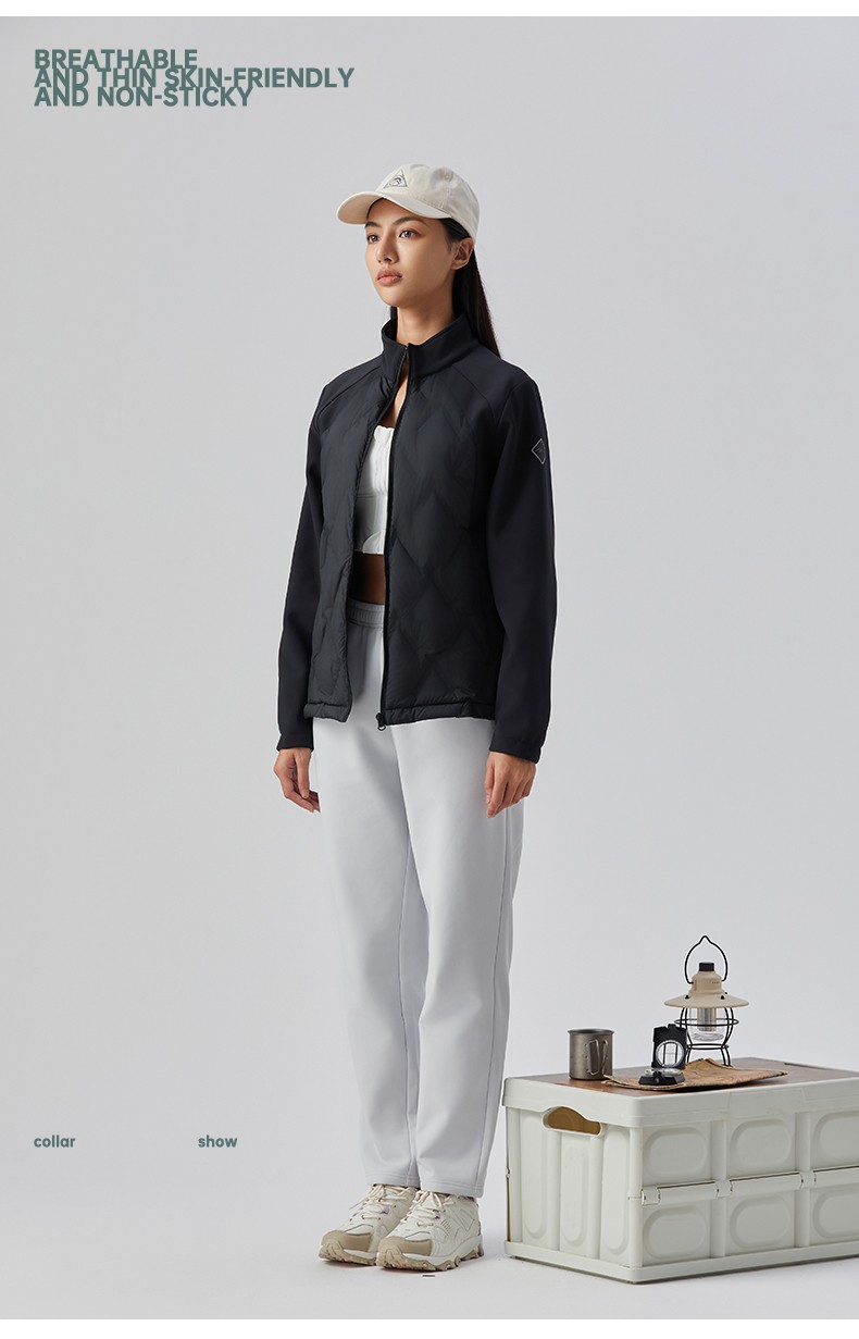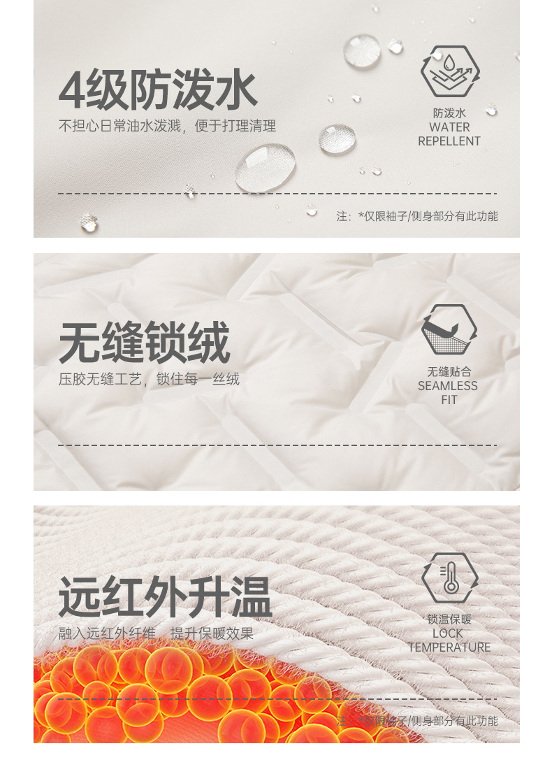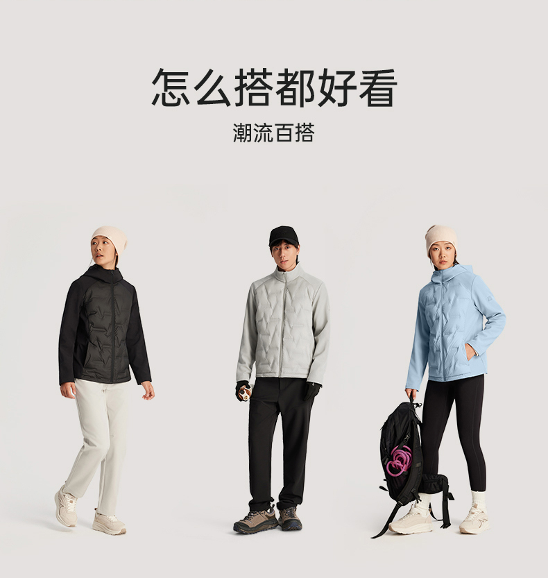 侧身/袖子拼接微弹升温科技的绒里软壳面料吸收反射人体热量,活动起来既无束缚感又与大身相结合,提供加倍温暖。