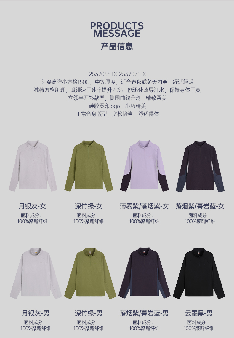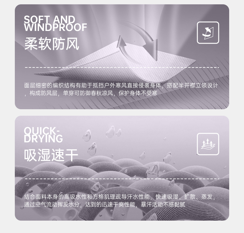 立领半开衫设计,既可以防住脖颈不受寒,也可以快速散热风,方便穿脱:侧缝拼接工艺丰富视觉设计感,展现体型柔感;正常合身版型,宽松不紧绷,适应多种身材穿搭