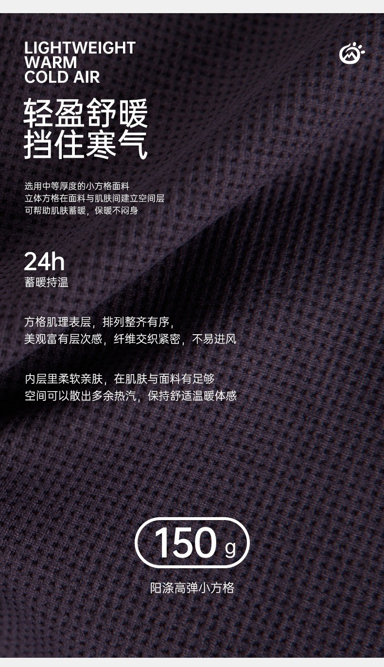 面料采用具备舒适弹力的小方格面料,具备一定厚度,保证穿着的自由伸展性和保暖性独特的方格肌理,为身体表层提供了疏导汗水的通道,可以快速排出热汗热汽,达到吸湿速干的性能