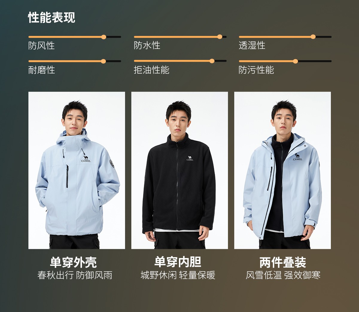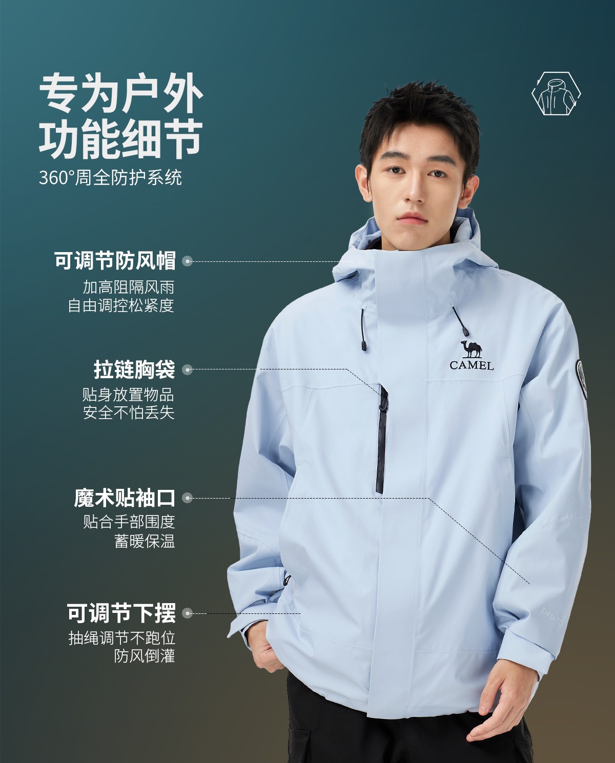防水外壳 抓绒内胆 可调节防风帽