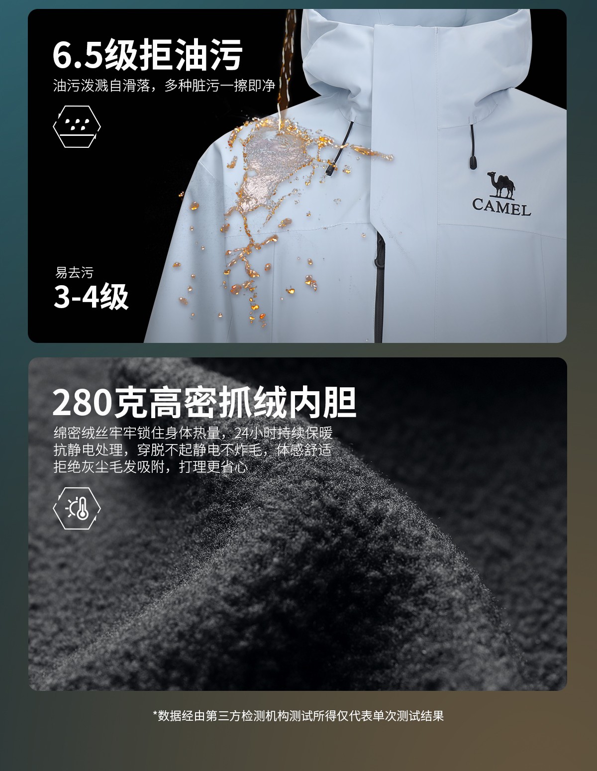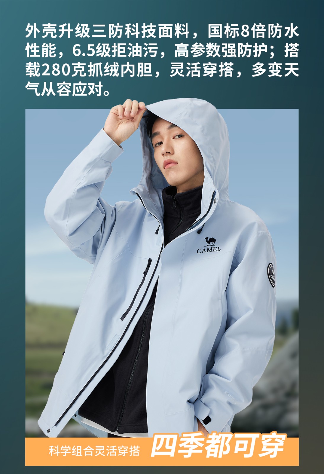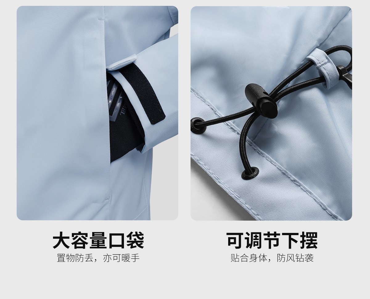 外壳升级三防科技面料,国标8倍防水性能,6.5级拒油污,高参数强防护;搭载280克抓绒内胆,灵活穿搭,多变天气从容应对。