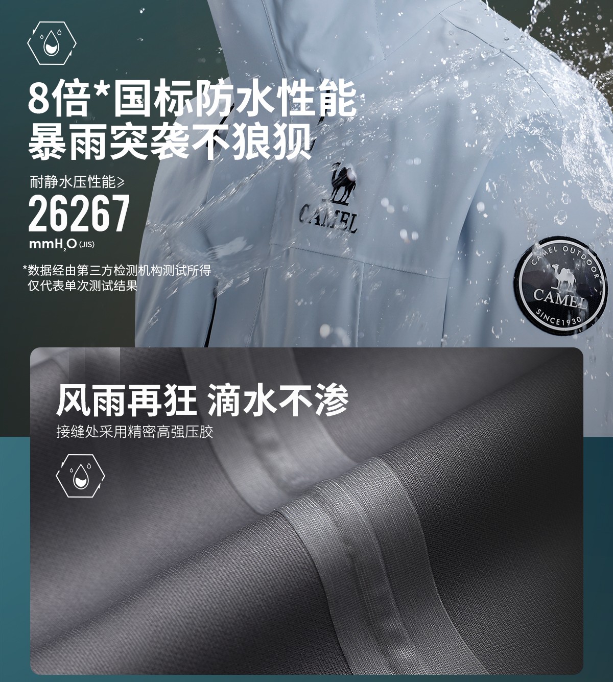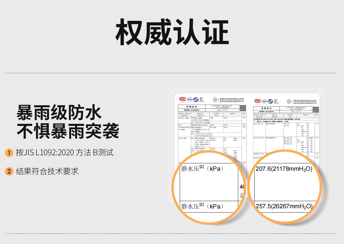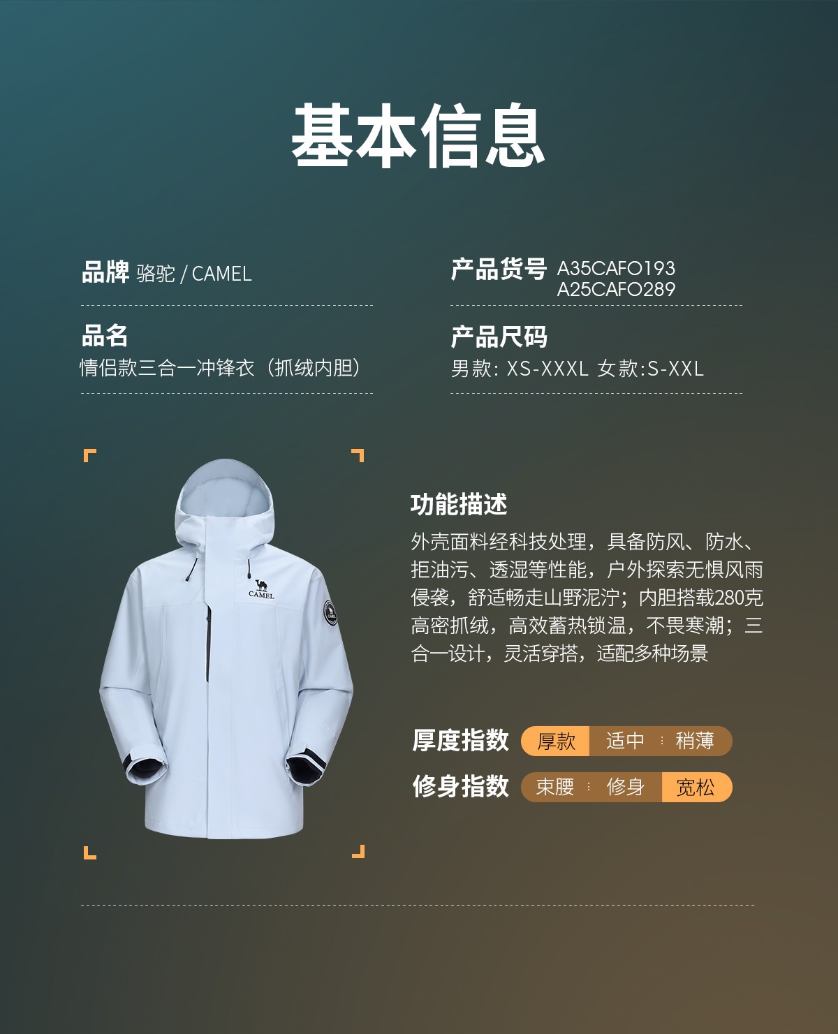 外壳升级三防科技面料,国标8倍防水性能,6.5级拒油污,高参数强防护;搭载280克抓绒内胆,灵活穿搭,多变天气从容应对。