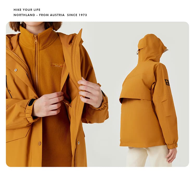 诺诗兰 【胡杨林2.0】冲锋衣 户外女士防风防泼三合一冲锋衣徒步登山服外套 NWJET2503E 棕黄色 防水防油防污 保暖防静电 防风透湿